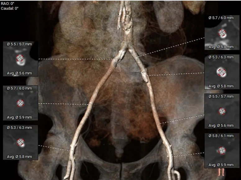 入路情况:主动脉弓部走行欠佳,主动脉弓部各主要分支开口处未见明显狭窄征象、未见发育变异,胸主动脉、腹主动脉走行较平直,管腔未见明显狹窄,双侧髂动脉-股动脉走形较平直,管腔未见明显狭窄,综合考虑,推荐右侧股动脉做为主入路,右侧股动脉穿刺水平管腔直径约为5.8mm,右侧股动脉分叉约在股骨头下1/3水平。