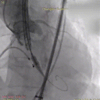 患者取平卧位,在全麻及经食道超声心动图(TEE)和血管造影联合引导下,成功穿刺右侧股动脉,置入20F输送鞘管。穿刺点血管直径5.8mm,入路通畅。猪尾导管下行主动脉根部造影,清晰显示主动脉形态及无返流。在跨瓣过程中,考虑到患者心尖部心肌薄弱,导丝塑形偏大,全程操作轻柔,避免心肌损伤。