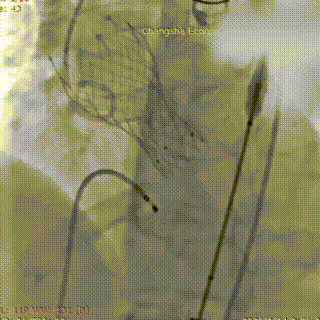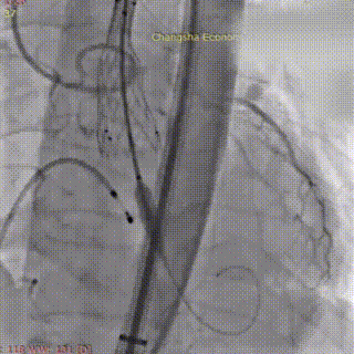 在调整血管活性药物至更稳定剂量、并做好所有应急准备后,再次进行球囊预扩张。此次扩张过程顺利,未再发生严重循环波动。造影证实球囊位置准确,无腰征,扩张过程顺利,无瓣周漏加重及冠脉阻塞征象。确定VenusA Deluxe DL 23 mm 自膨式经导管主动脉可回收瓣膜系统,经超硬导丝送瓣膜输送系统平稳通过股动脉、髂动脉及腹主动脉,无阻力送至主动脉瓣环位置。经多角度造影确认瓣膜支架标记点与主动脉瓣环、冠脉开口相对位置。最终,将瓣膜稳定释放并锚定于标准解剖位置。造影及TEE显示:人工瓣膜支架展开形态良好,无显著瓣周漏;主动脉瓣前向血流显著改善,平均压差大幅下降;左右冠状动脉显影清晰,患者血流动力学指标立时改善。
