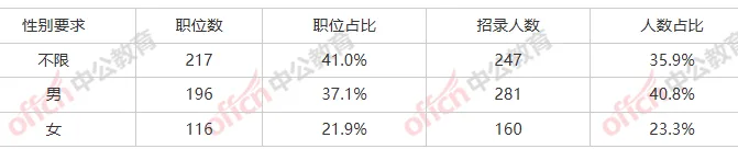 职位性别要求:男占比40.8%,计划招录281人,计划196个职位。性别要求:不限占比35.9%,计划招录247人,计划217个职位。