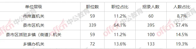 招考单位层级分析:县市区机关占比57.4%,计划招录395人,计划339个职位。乡镇办机关占比19.3%,计划招录133人,计划72个职位。