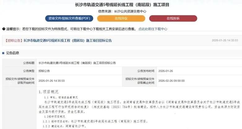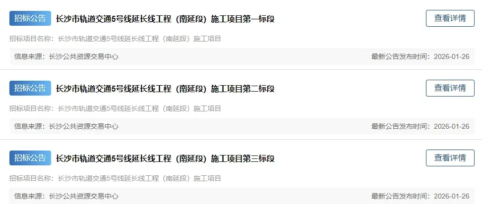 在今天2026年1月26日,长沙公共资源交易中心连发3条关于5号线南延的施工项目招标公告。施工招标,这意味着地铁5号线南延线离正式开工不远了!明细如下: