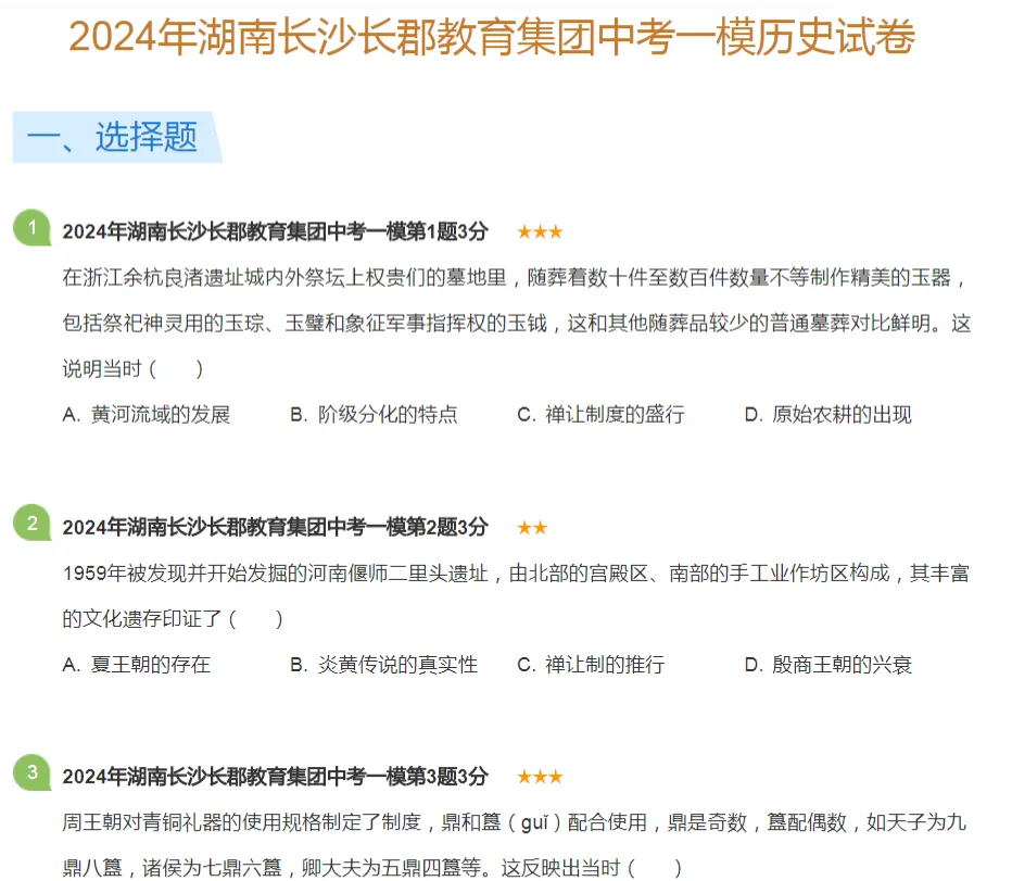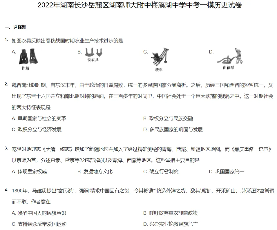 2019-2024年长沙各区初三中考一模历史试卷及答案解析.pdf