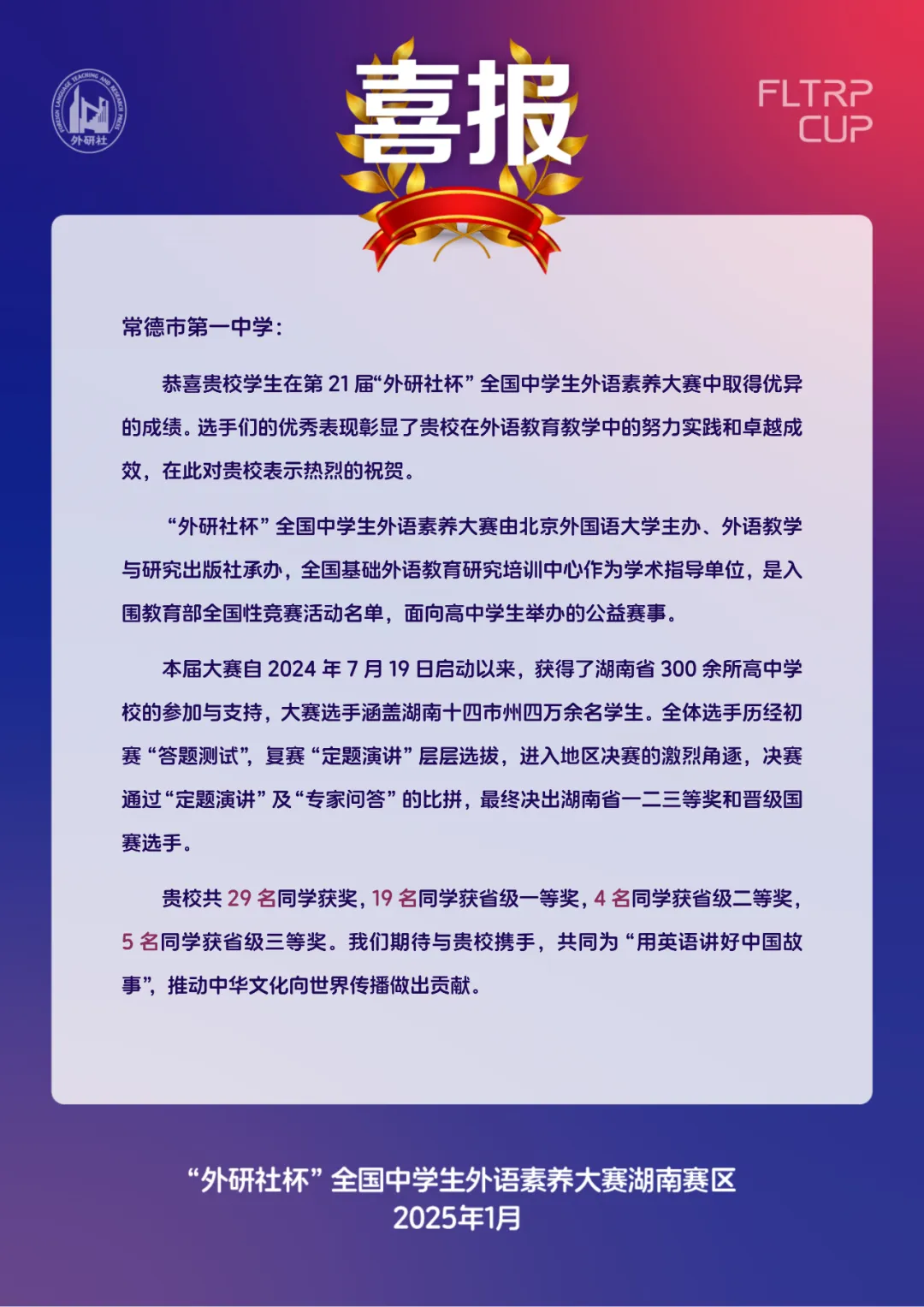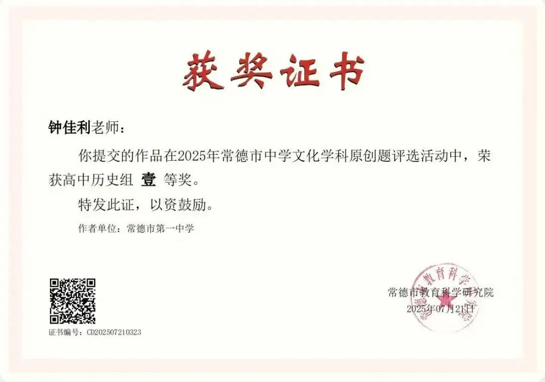 2025年,常德市一中在研市级课题6项、省级课题12项;市级以上发表或获奖论文90余篇,其中省级发表或获奖论文50余篇。