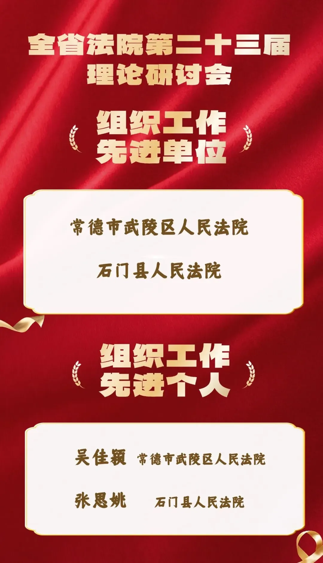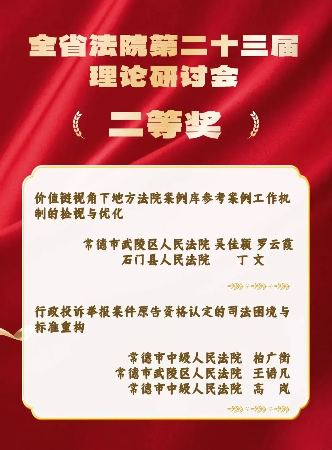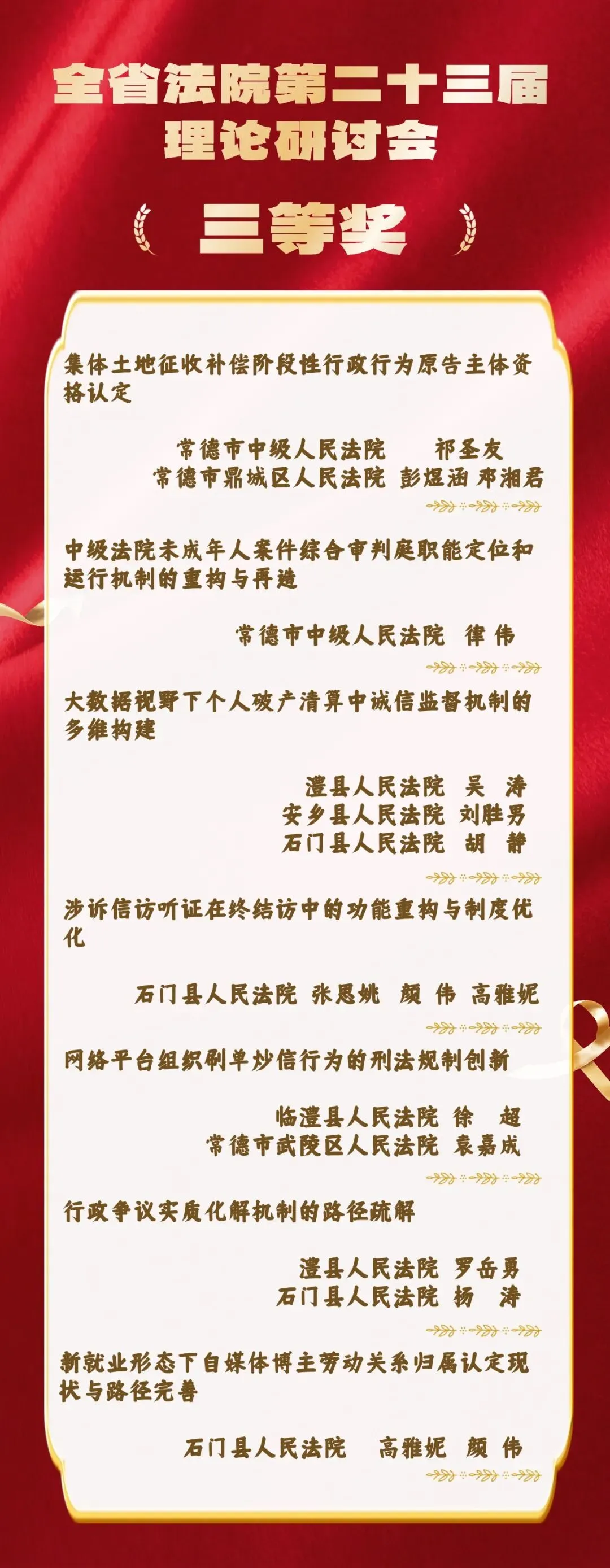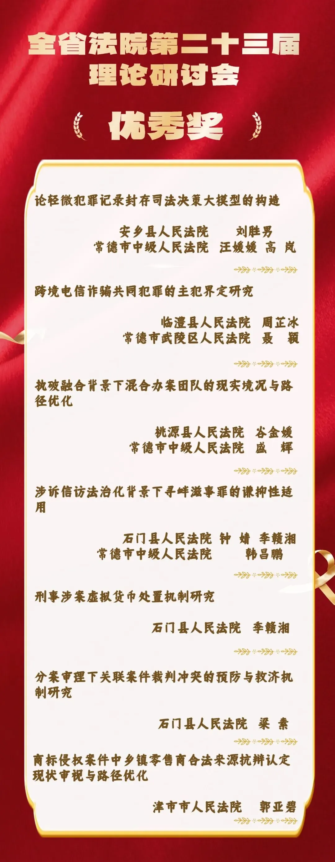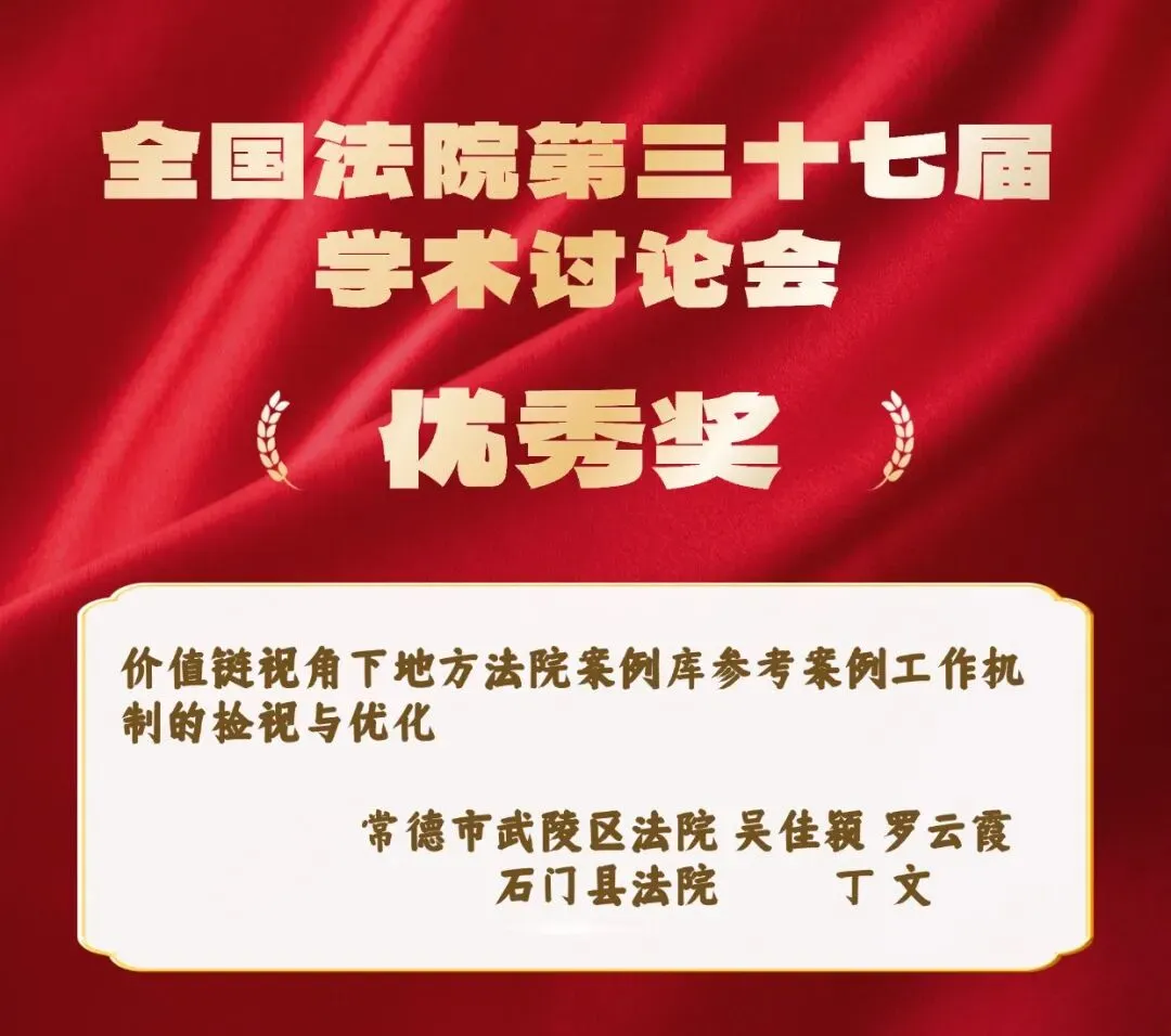 近日,湖南省高级人民法院下发《关于全国法院第三十七届学术讨论会暨全省法院第二十三届理论研讨会评选结果的通报》,常德法院报送的《价值链视角下地方法院案例库参考案例工作机制的检视与优化》等16篇论文喜获奖项。