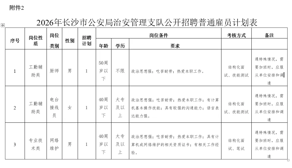 详见《2026年长沙市治安管理支队公开招聘普通雇员招聘计划表》(附件2)