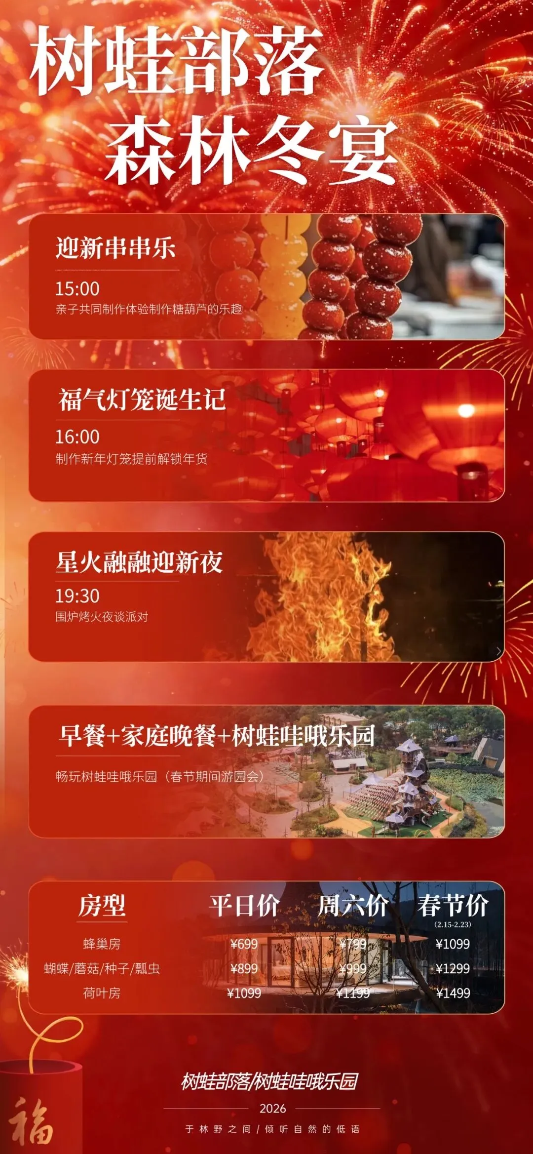 单看住宿就知道有多值:新余树蛙部落春节期间,热门荷叶树屋日历房一晚价格已飙升至1499元,蜂巢房一晚也要1099元,仅两晚住宿费就快覆盖营费大半。