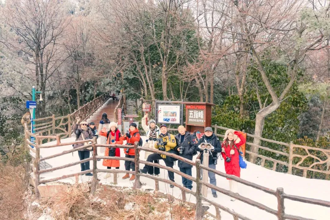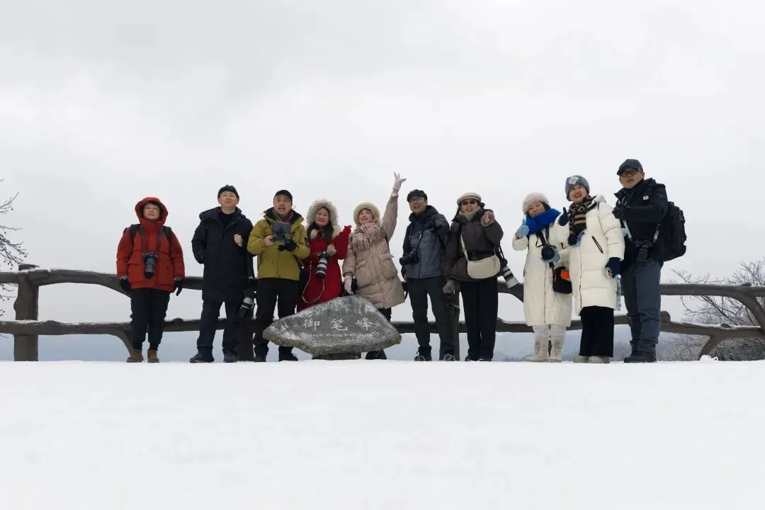 三天的拍摄,九位摄影师一头撞进武陵源风景名胜区三千奇峰的冰雪盛境。清晨我们迎着微光登山,此时的冰晶尚未消融,每一根松针上都缀满通透的霜花,在侧逆光下折射出细碎金辉 。林间有光、峰顶堆雪,群山列阵如千军奔袭而至,云雾缠绕如画卷徐徐展开。大家一阵阵惊呼:“太值了”、“哇,我们运气超好哦”……只见,有的拿出广角,有的端起长焦,有的架起微距,更多的是在遥控着无人机。于是:神兵聚会,天女散花,点将台,哈利路亚山……每一处大自然的鬼斧神工,都被我们摄影人以镜头为笔,以冰雪为墨,用一帧帧作品,定格出大美武陵源的雪韵风华。