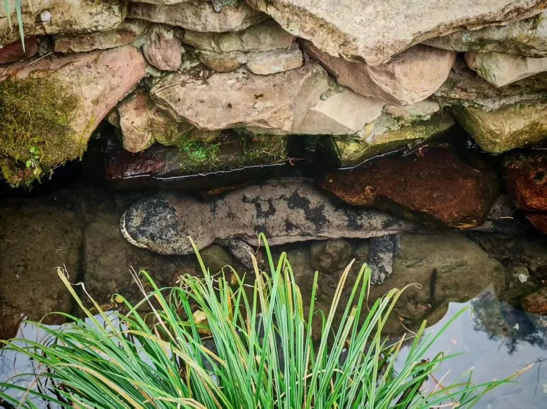顺着水流往后面走,近处是溪流,远处是山脉,感觉走得很惬意。在一条河边还看到了野生的娃娃鱼,一开始趴着一动不动,后来不知道是不是人多了给个面子,稍微动了下尾巴。