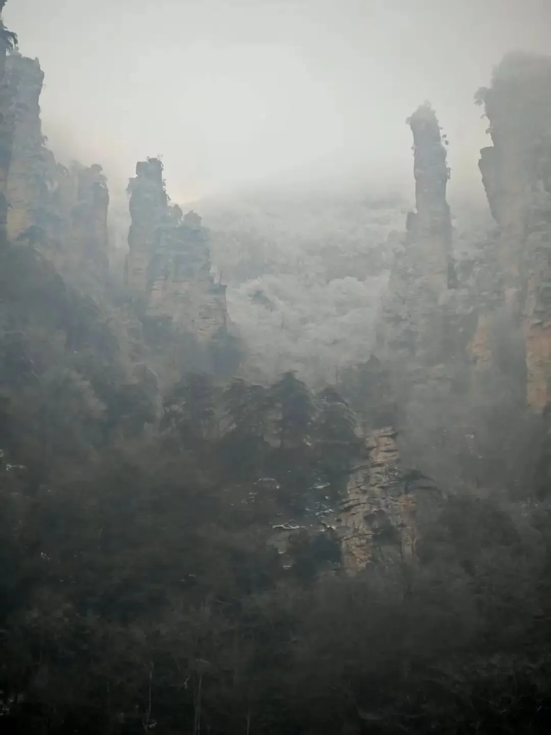 今天zsy状况好了不少,我们就前往天子山了。由于这两天大降温,张家界这里下起了雪,山上更是白雪皑皑。而且天子山海拔还相当高,我们坐缆车上去时被云雾遮蔽视线,逐渐都看不清周围。缆车里的电视还在播什么“你已经不是普通的游客,而是远道而来的修行之人……”,byd问你了吗?