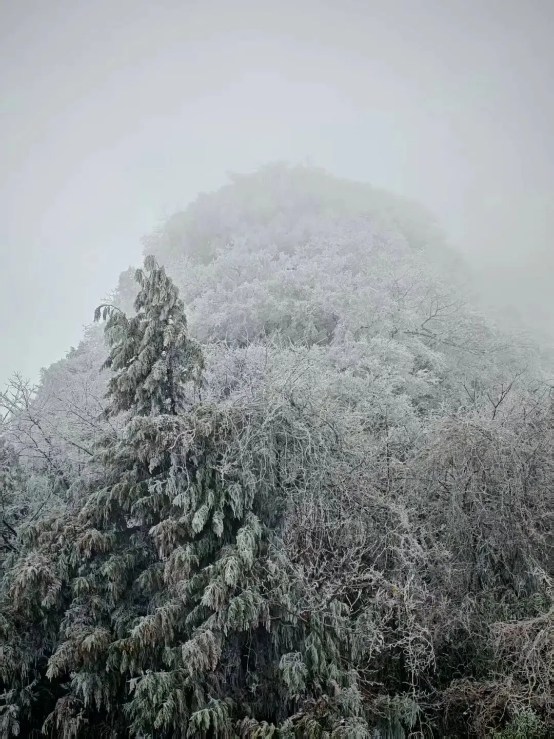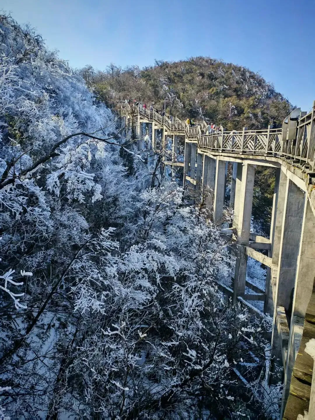 到了山顶一下缆车,顿时一阵寒风扑面。我赶紧带上手套,顶着寒意观赏。不得不说下了雪之后山上真的很好看,书上结满了雾凇,远处的山上也是白茫茫一片。