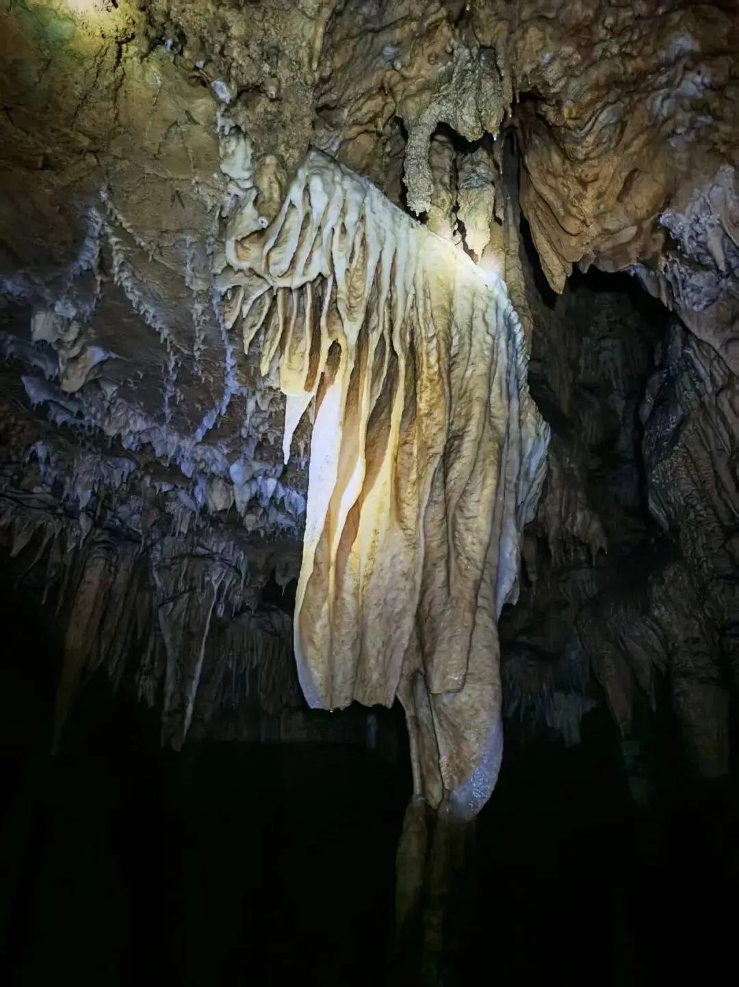 后面我们还到了内部一个洞窟去看,里面没有灯,每个人要带个矿工帽进去。负责讲解的姐姐感觉对这份工作很有热情啊,中间还和我们有互动环节,让我们把灯关了聆听水滴落的声音,周围一片漆黑真的啥也看不见(还有视觉剥夺系),说这就是当时负责勘察黄龙洞的团队在这里迷路的状态,想想还是挺哈人的。