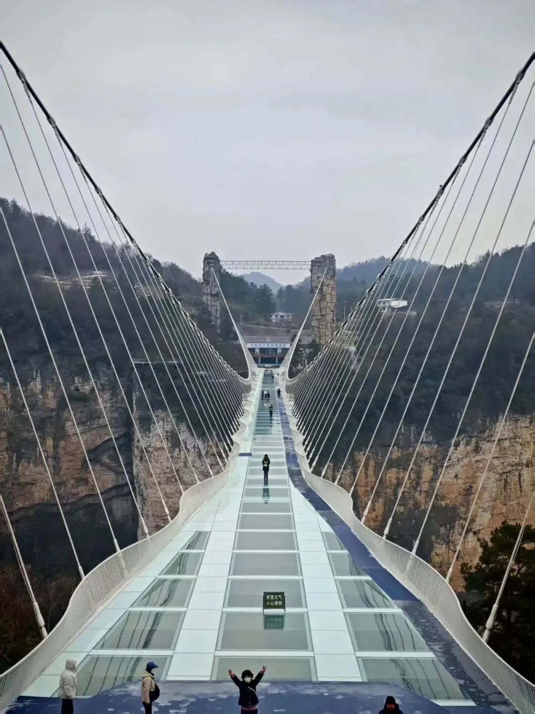 第六天咱们去的是玻璃桥大峡谷。那既然叫这个名字,最出名的当然就是一个玻璃大桥了。由于雨雪融化,玻璃桥上很滑,所以要穿戴鞋套,不然摔一下也挺疼的。