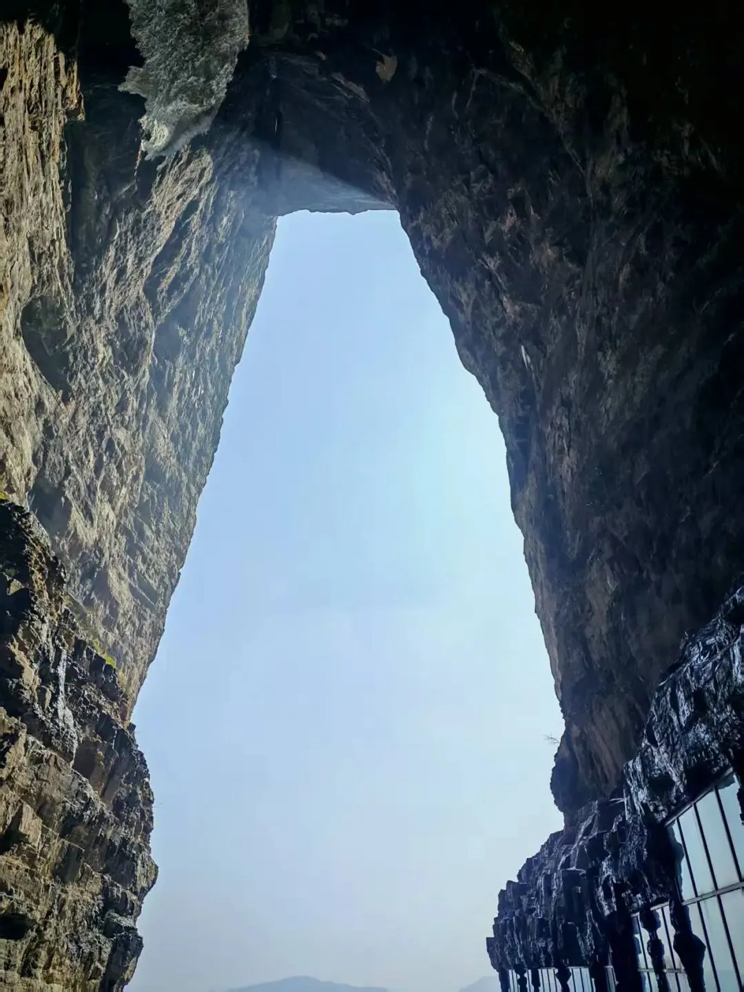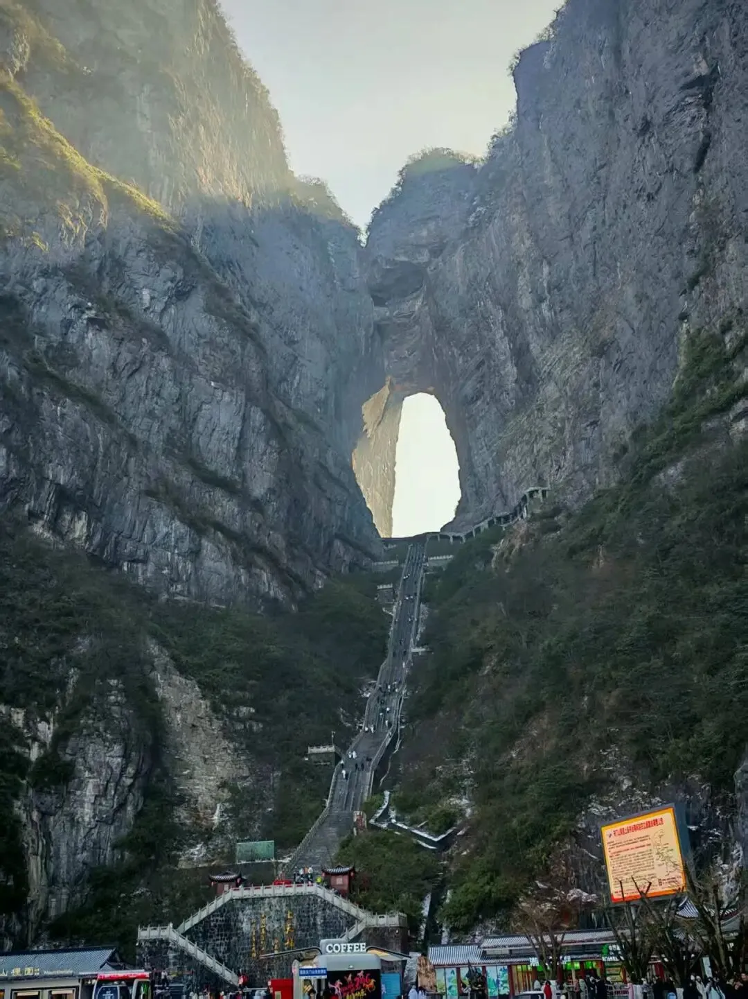 天门山也要先做缆车上山。然后走一段栈道就到了天门山的天门。如果不是因为fk说这几天走的脚有点疼的话,我就真的走这个999级的台阶上去了,最后么我们是坐的电梯上去,这电梯也得坐个十几分钟,可见还是很高的。