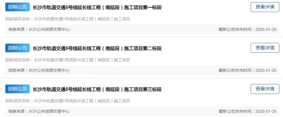 长沙地铁5号线南延有新进展啦!近日,长沙公共资源交易中心连发3条长沙市轨道交通5号线延长线工程(南延段)施工项目招标公告。