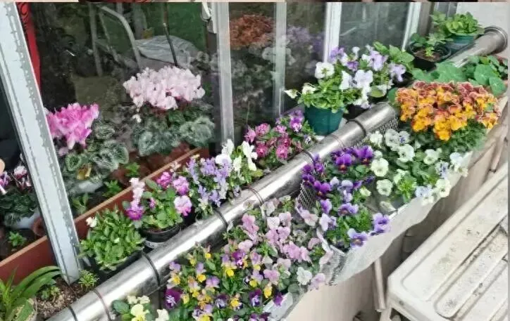 窗台上摆满盆栽 , 栏杆挂小花篮 , 旱金莲、天竺葵、角堇、矮牵牛、大岩桐、蝴蝶兰、仙客来……塞得满满当当。