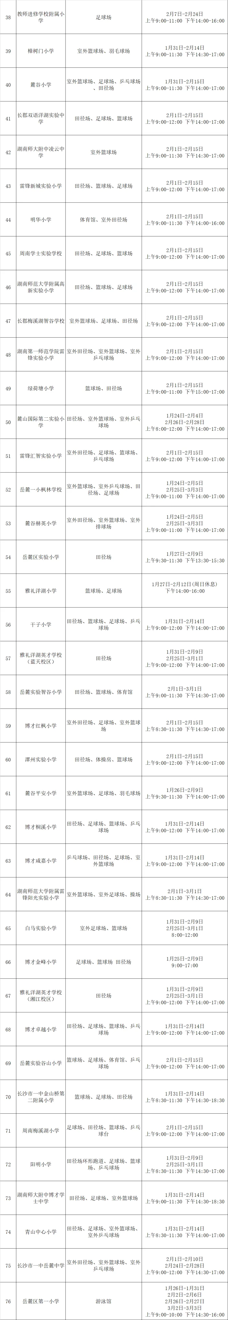 记者今天从湖南湘江新区教育局获悉,该区76所中小学校的体育场馆今年寒假期间免费对外开放,进一步推动居民健康生活方式的普及。