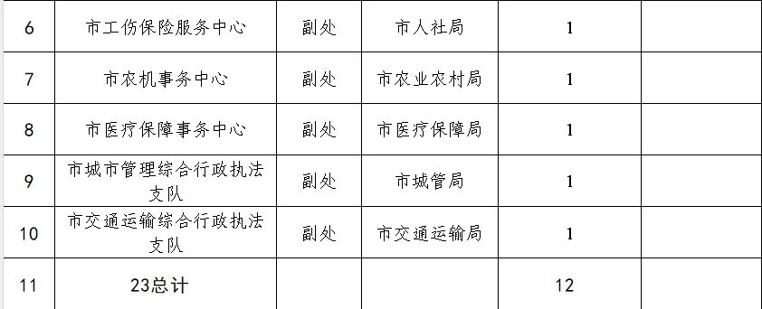 以及多个副处级参公事业单位,如市工伤保险服务中心、市农机事务中心、市医疗保障事务中心、市城市管理综合行政执法支队、市交通运输综合行政执法支队各1岗。