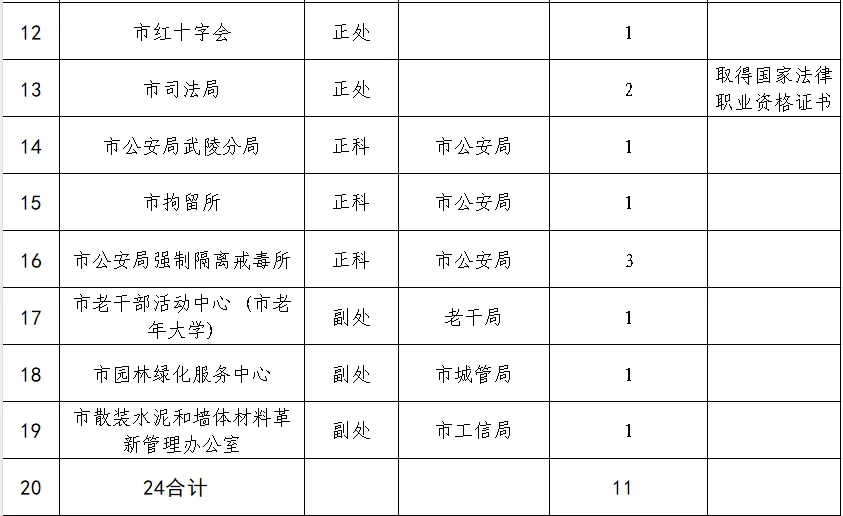 包括:市红十字会(1岗)、市司法局(2岗,要求取得国家法律职业资格证书);公安系统岗位依然较多,如市公安局武陵分局(1岗)、市拘留所(1岗)及市公安局强制隔离戒毒所(3岗);