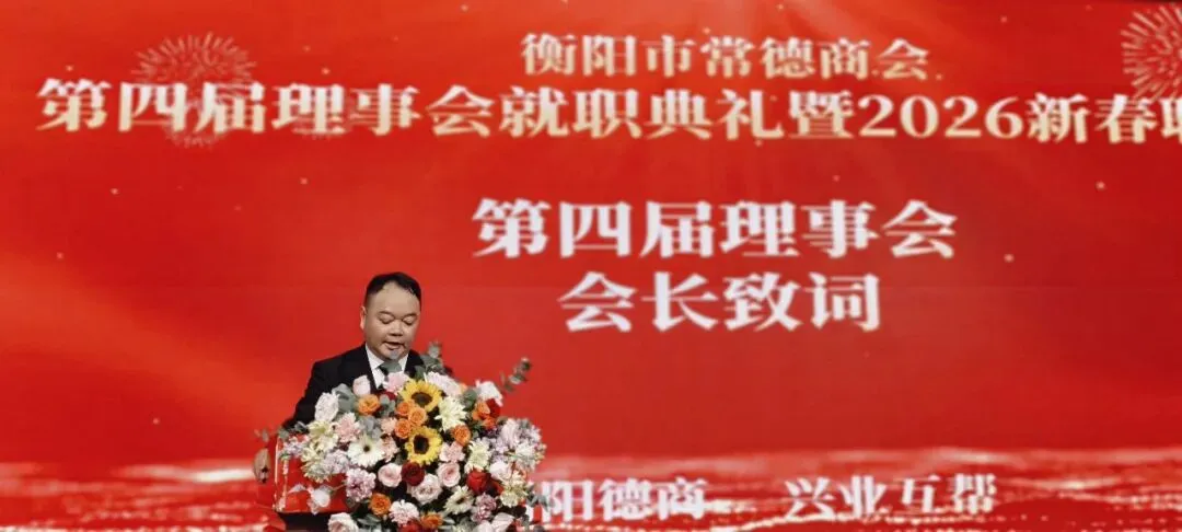 在就职典礼上,衡阳市常德商会第四届会长袁祥发表了热情的致辞。他首先向长期以来关心支持商会发展的各级领导、乡贤及全体会员致以最诚挚的谢意,动情地谈到,常德籍企业家在衡阳的每一步成长,都离不开乡音的牵引与乡情的支撑,而新一届理事会的诞生,正是全体会员凝心聚力、共谋发展的必然选择,更是一份沉甸甸的信任与嘱托。他承诺,新一届理事会将始终坚守“服务会员、回馈社会”的初心,把会员的急难愁盼放在心上,把商会的发展重任扛在肩上,以“一家人、一条心、一件事”的信念,团结带领全体乡贤深耕衡阳、扎根湘南,让商会成为大家创业路上的坚强后盾、情感归属的温暖港湾。