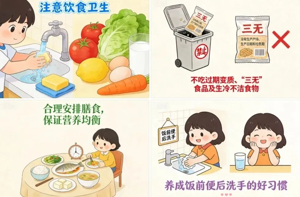 注意饮食卫生,不吃过期变质、“三无”食品及生冷不洁食物,不暴饮暴食。养成饭前便后洗手的好习惯。合理安排膳食,保证营养均衡。
