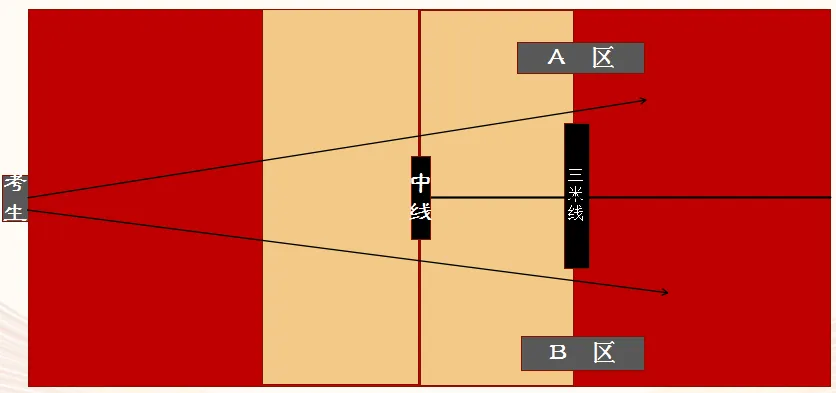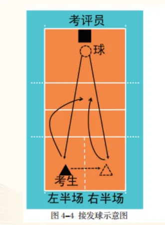 考生在规定区域内准备,接考评员从对方场区发的各种来球,左半场区接5次,右半场区接5次,共接10次来球。如图 4-4 所示。每次根据垫球进入区域的不同获得相应的分数,累计10次接发球得分为最终成绩。