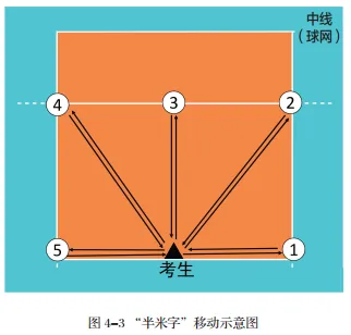 考生面向球网,从起点(端线中点)起动,计时开始,先向1号点移动,击倒1号点标志物后,应立即返回起点并击倒起点处标志物,再向2号点移动,以此类推,直到击倒5号点标志物回到端线中点(须将每个标志物击倒,否则不计成绩),计时停止,记录完成的时间。每人测试2次,取最好成绩。如图4-3所示。