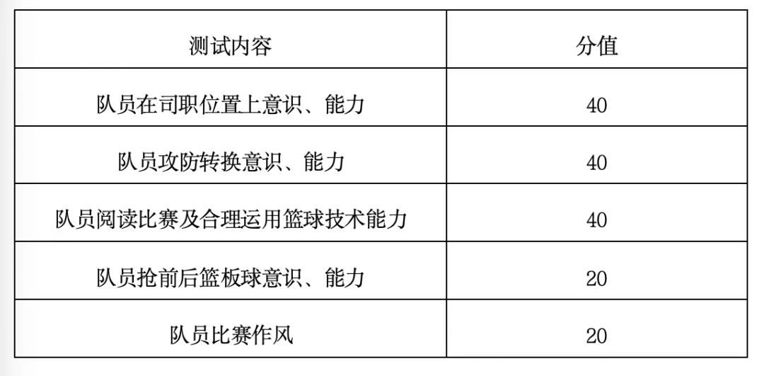 测试方法:分队教学比赛,双方根据教练安排采用人盯人、联防等战术进行实战演练。