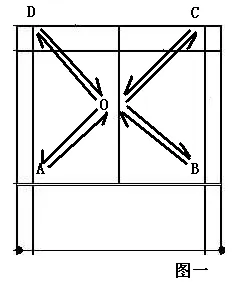 考生站位于单打场地的正中位置(O点)。听到指令后从(O点)移到(A点),(A点)返回(O点);从(O点)移到(B点),(B点)返回(O点);从(O点)移到(C点),(C点)返回(O点);从(O点)移到(D点),(D点)返回(O点)。重复二次,记时计算成绩。(见图一)