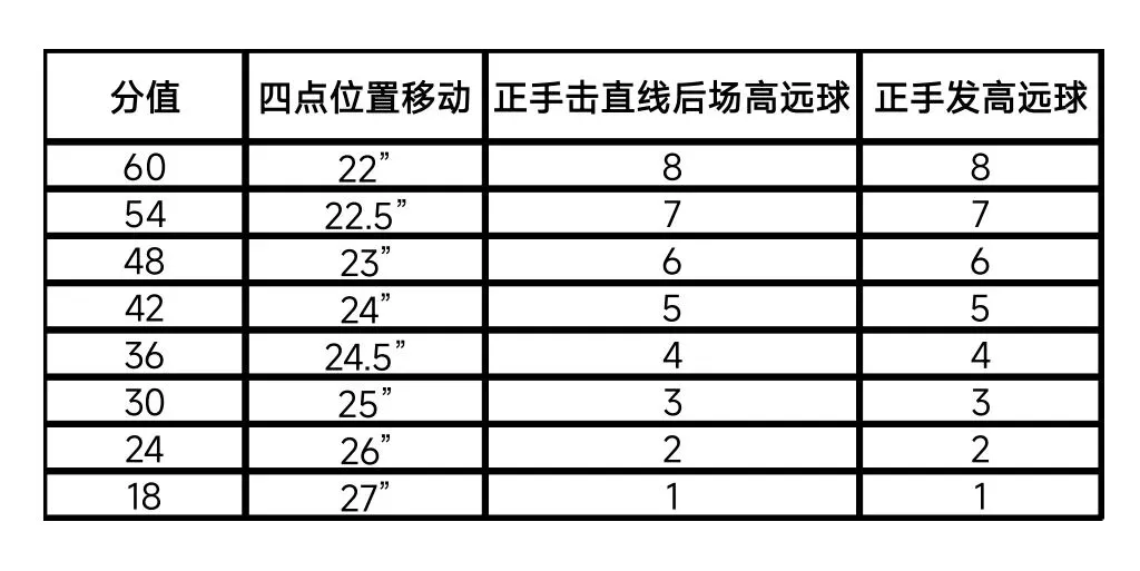 动作要求:受试者从单打场地的左和右发球区内分别发出高远球。发出的球应以较高的弧线飞行,垂直下落到斜对角发球区的双打后发球线到端线之间的区域内。左右各发5个球。(见评分标准)