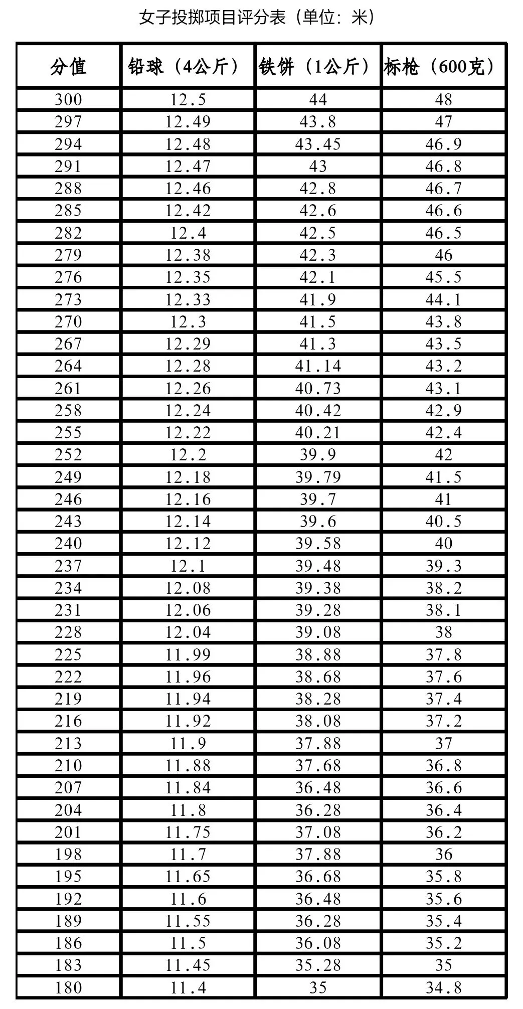 每名考生均有三次试投机会,记取最好成绩换算成得分。投掷项目所使用的器材重量,均以最新国际田联田径规则规定的成人比赛器材规格为标准。