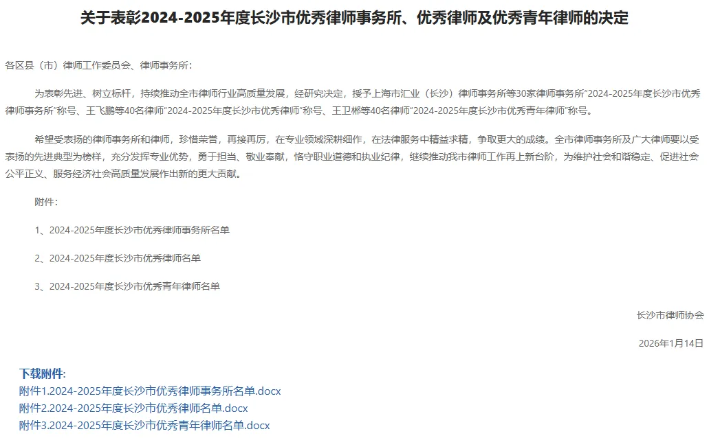 2026年1月14日,长沙市律师协会发布了《关于表彰2024-2025年度长沙市优秀律师事务所、优秀律师及优秀青年律师的决定》。我所徐丰林律师凭借其出色的专业能力、高度的职业责任感与良好的行业声誉,荣获“2024-2025年度长沙市优秀青年律师”称号。