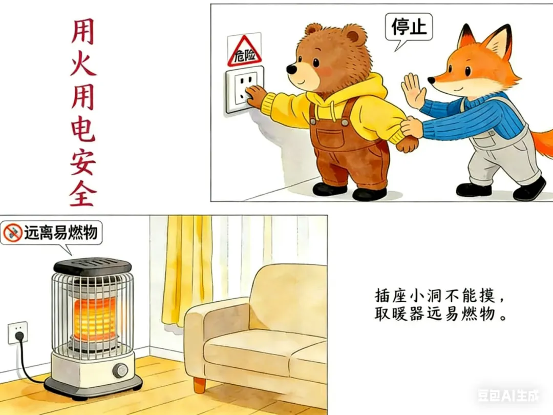 ❸家长切莫放松对孩子的监护管理,注意各类取暖设备的使用安全,严禁使用易引发事故的各类电器。要将家里的打火机和火柴等物品放置在高处。