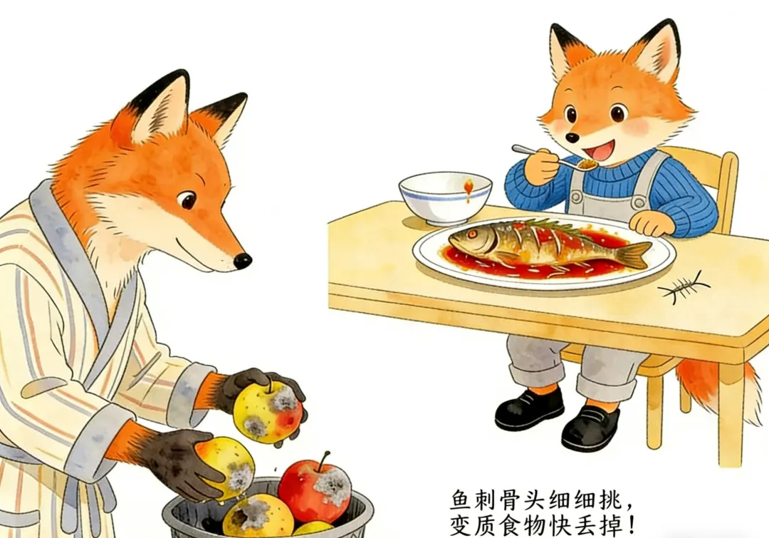 ❷提醒孩子养成良好的饮食习惯,饭前要洗手,洗干净、煮熟了的食物才能食用。