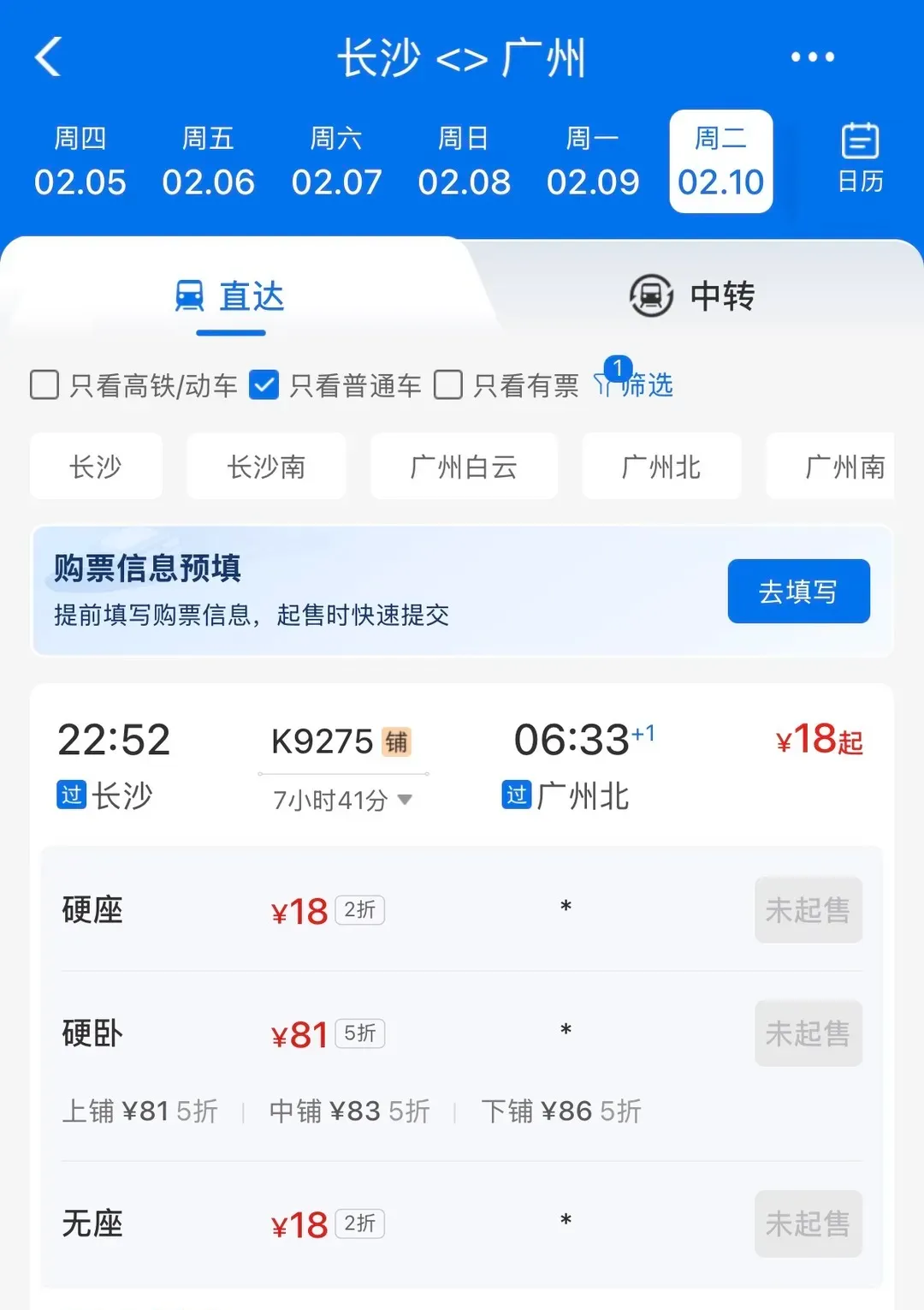 临近春节,从长沙至广州的火车票只要18元?这是真的。2026年春运即将于2月2日开始,记者发现,在2月10日,铁路部门将发售长沙站至广州北站的普速列车,其中硬座2折后18元、硬卧5折后81元,全程耗时7小时41分钟,实现夕发朝至,吸引众多网友关注。其实,这已非新鲜事。据广铁集团客运部工作人员介绍,春运火车票打折主要是对部分非紧张时段、方向的旅客列车实行优惠票价。近年来,铁路不断扩大市场化定价的适用范围,让火车票由原来的固定、单一票价机制优化调整为灵活折扣、有升有降的市场化票价机制。这也被很多人称为“反向春运”“反向火车票”,指的就是相对冷门和低价的班次。不仅如此,记者还发现,从2月2日起,K4236桂林至永州的火车票最低5.5元,为硬座和无座票,到目前已开售的火车票日期(2月9日),每天都有这趟特价班次,目前2月9日仍有少量余票,其余日期已售罄。版权归原作者所有,如文章内容、图片、字体有侵权,请联系我们删除。- END -