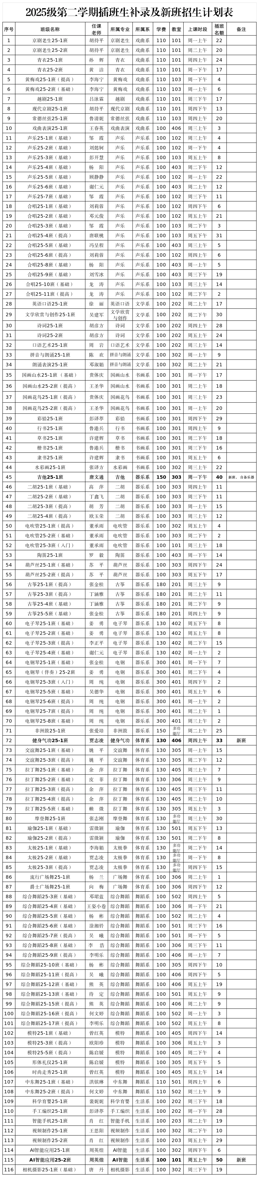2025级第二学期,学校共开设班级129个,其中吉他25-1班、健身气功25-1班、AI智能应用25-2班为新增班级。本次插班生可报班级及剩余名额、新班招录人数等详细信息,详见附表《常德市老干部(老年)大学2025级第二学期插班生补录及新班招生计划表》,请报名前仔细查阅。