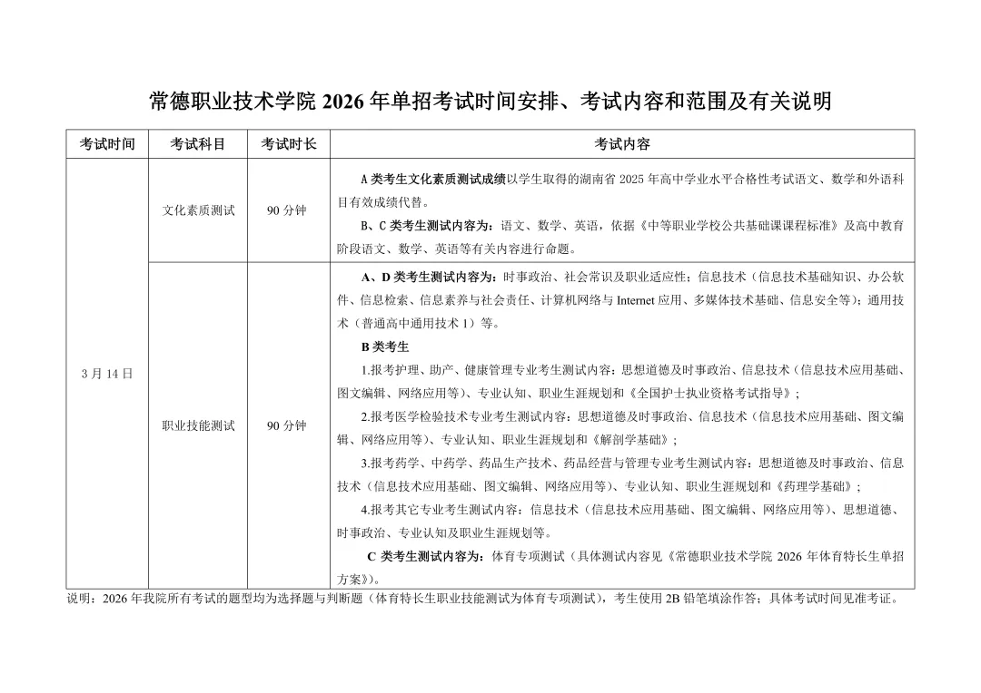 >常德职业技术学院2026年单独招生考试大纲