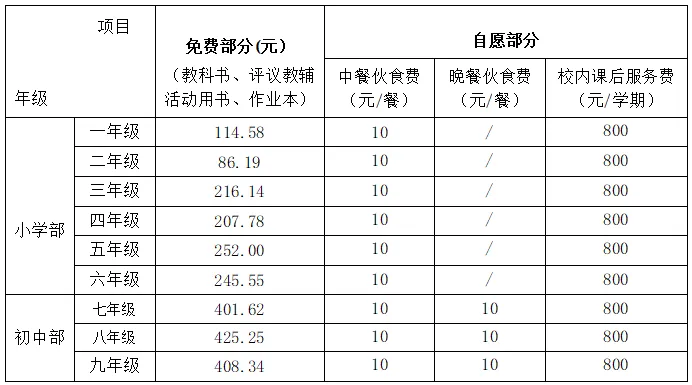 2024年秋季本校义务教育阶段学生教科书费、教辅资料费、作业本费和其他活动用书费全额免费。