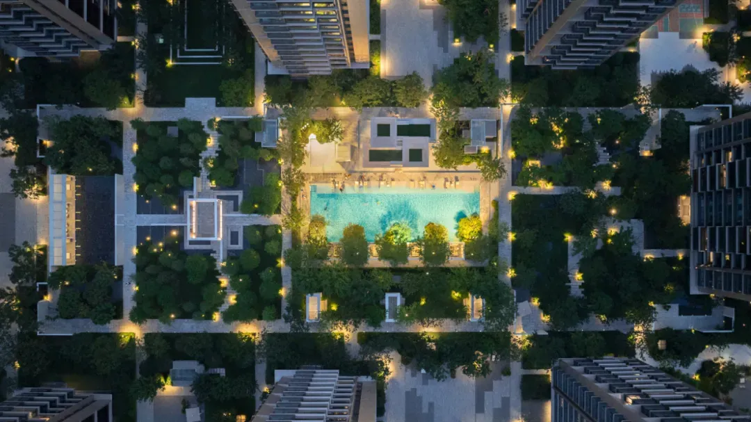 此区域被构想为住宅的核心,灵感源自长沙静谧的山峦。设计旨在通过丰富的绿植与水景相结合,营造一种宁静而充满活力的环境,森林般的框架尤为引人注目。层叠的水景元素仿佛山间瀑布,为空间增添了听觉与视觉上的宁静感。多功能草坪为社交聚会提供了灵活的空间,既促进了人际互动,又保留了宁静的休憩氛围,打造出真正的社区核心。以达到沉浸式自然疗愈的身心的度假中。我们相信,真正的放松, 是存在于不同节奏的空间转换中的。