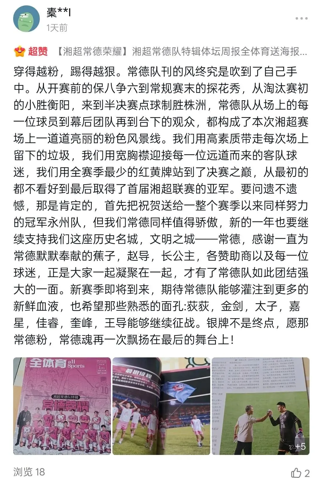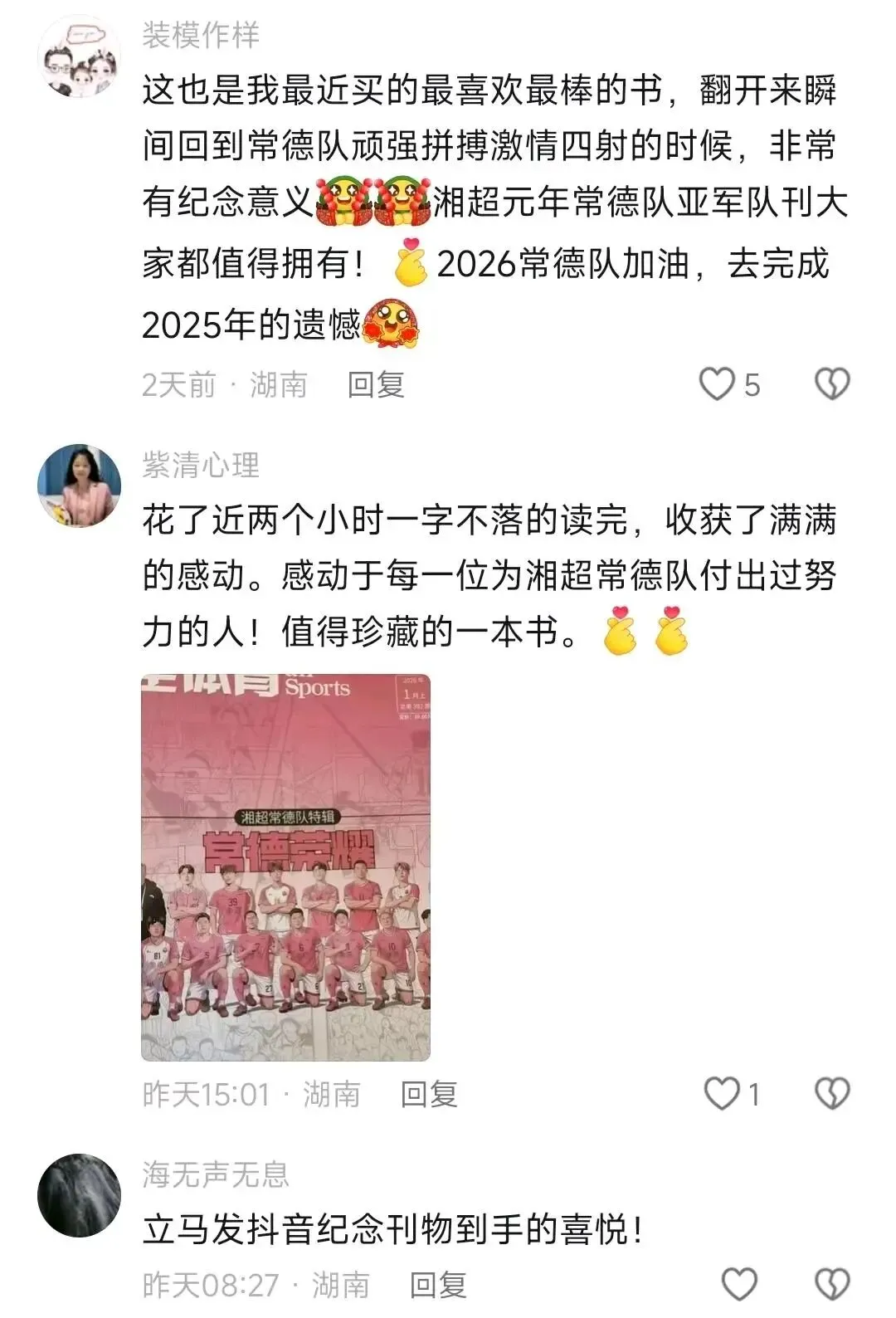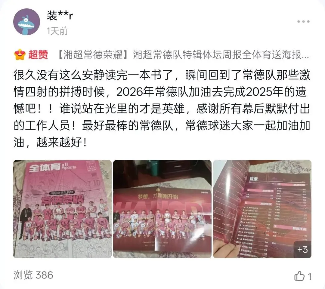 常德队刊热度的背后,是跨界团队的用心打磨。特辑由《体坛周报》与常德市融媒体中心(筹)联合出品,集结近20名记者的深度报道或访谈。为了捕捉球员、教练员最真实的心境,记者们常常在采访结束后,连夜梳理录音、撰写文稿,逐字逐句打磨内容,力求让每一段文字都传递出赛场的热血与人物的温度。《常德日报》《湖南日报》、湖南卫视等媒体的摄影记者及诸多热心球迷蹲守比赛现场所拍摄的大量精美照片,让每一页画面都记录了热辣滚烫的“湘超”历史。