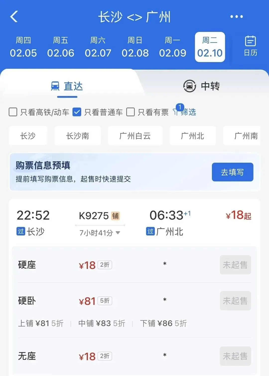 临近春节,从长沙至广州的火车票只要18元?这是真的。2026年春运即将于2月2日开始,记者发现,在2月10日,铁路部门将发售长沙站至广州北站的普速列车,其中硬座2折后18元、硬卧5折后81元,全程耗时7小时41分钟,实现夕发朝至,吸引众多网友关注。其实,这已非新鲜事。据广铁集团客运部工作人员介绍,春运火车票打折主要是对部分非紧张时段、方向的旅客列车实行优惠票价。近年来,铁路不断扩大市场化定价的适用范围,让火车票由原来的固定、单一票价机制优化调整为灵活折扣、有升有降的市场化票价机制。这也被很多人称为“反向春运”“反向火车票”,指的就是相对冷门和低价的班次。不仅如此,记者还发现,从2月2日起,K4236桂林至永州的火车票最低5.5元,为硬座和无座票,到目前已开售的火车票日期(2月9日),每天都有这趟特价班次,目前2月9日仍有少量余票,其余日期已售罄。来源:三湘都市报