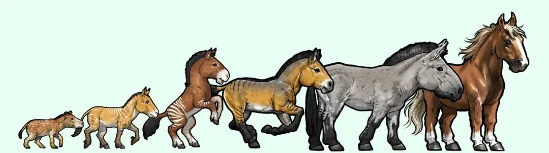 早在5000多万年前的始新世时期,有一种小型的有蹄类动物,它的体长与小狗接近,脚趾数量像如今的貘一样,前足有四趾,后足有三趾,这就是马的直系祖先——始祖马,目前被认为属于古兽马科。初期的马科形态突出了小体型、拱形背、多趾的特点。