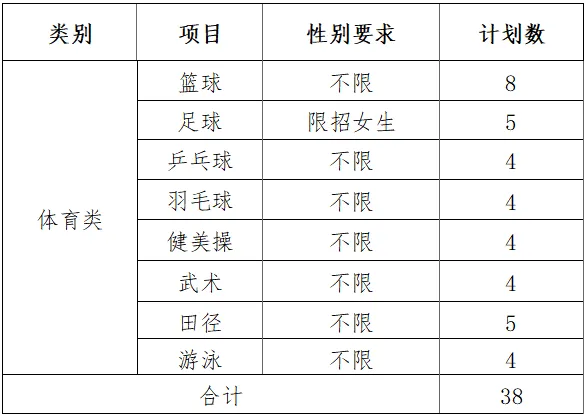 体育类特长生:乒乓球2名,羽毛球2名,健美操2名,武术2名,田径2名,足球2名,篮球2名,游泳2名。