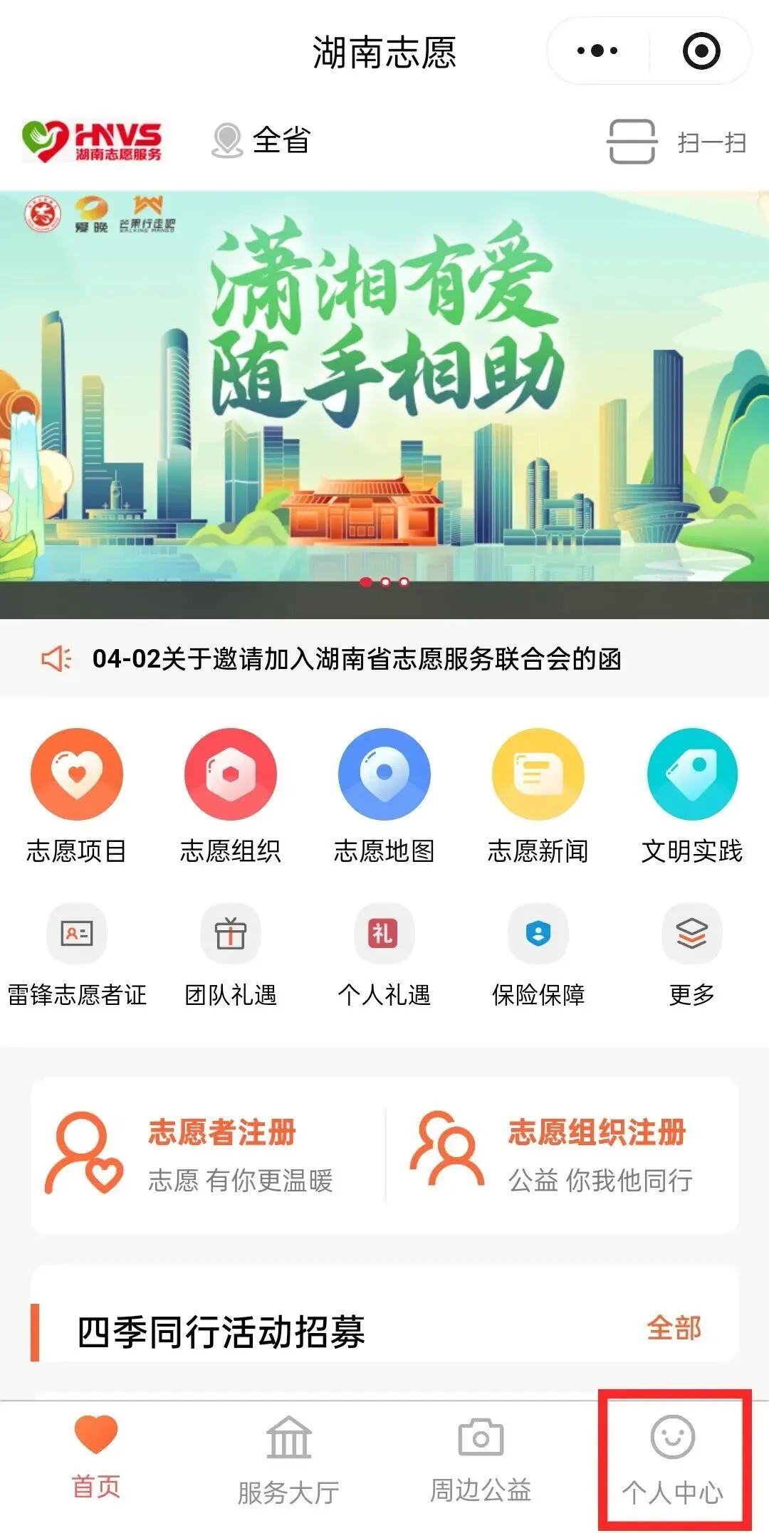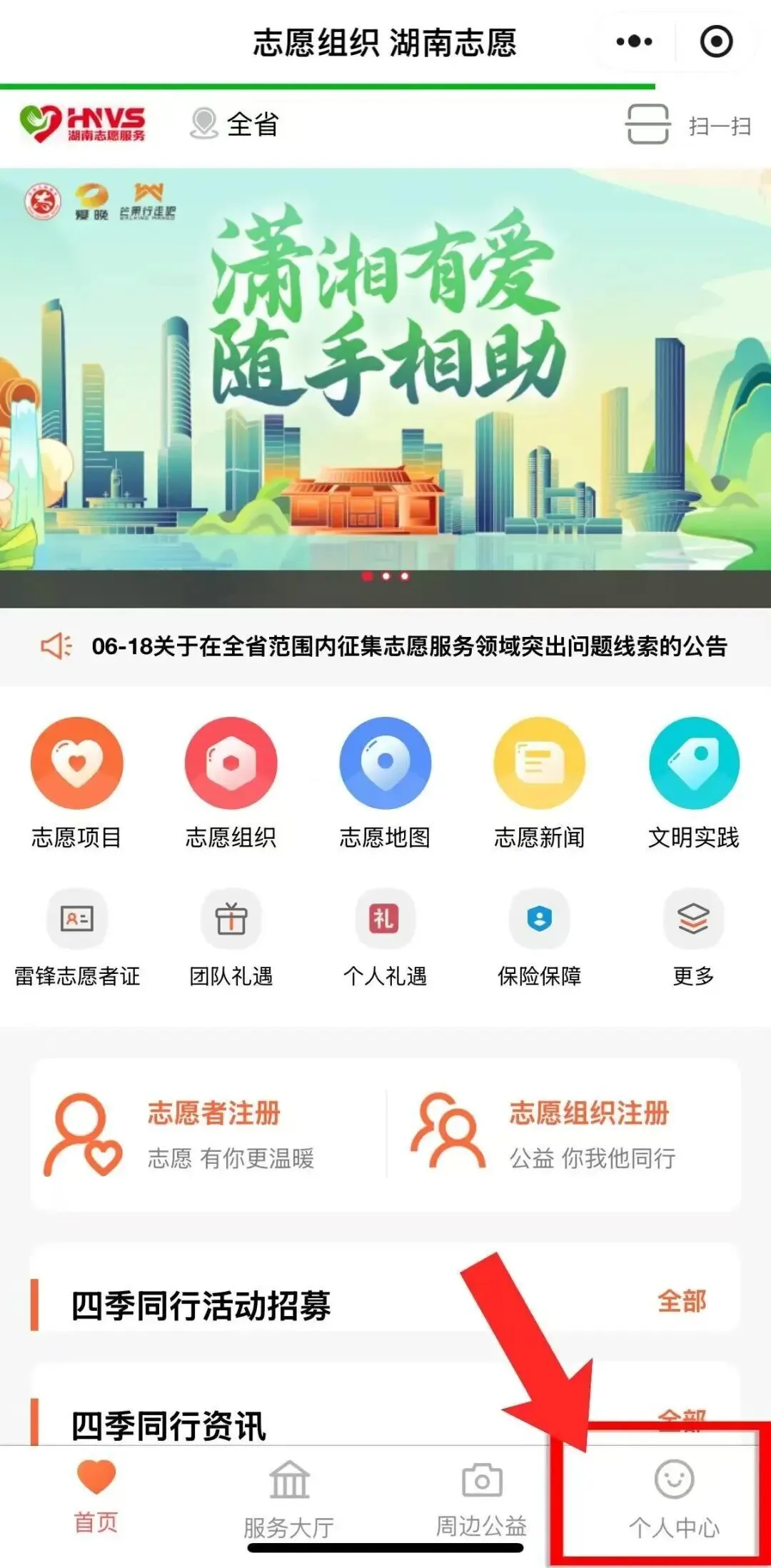 2. 打开“湖南志愿”微信小程序点击右下角“个人中心”进行志愿者注册并登录。