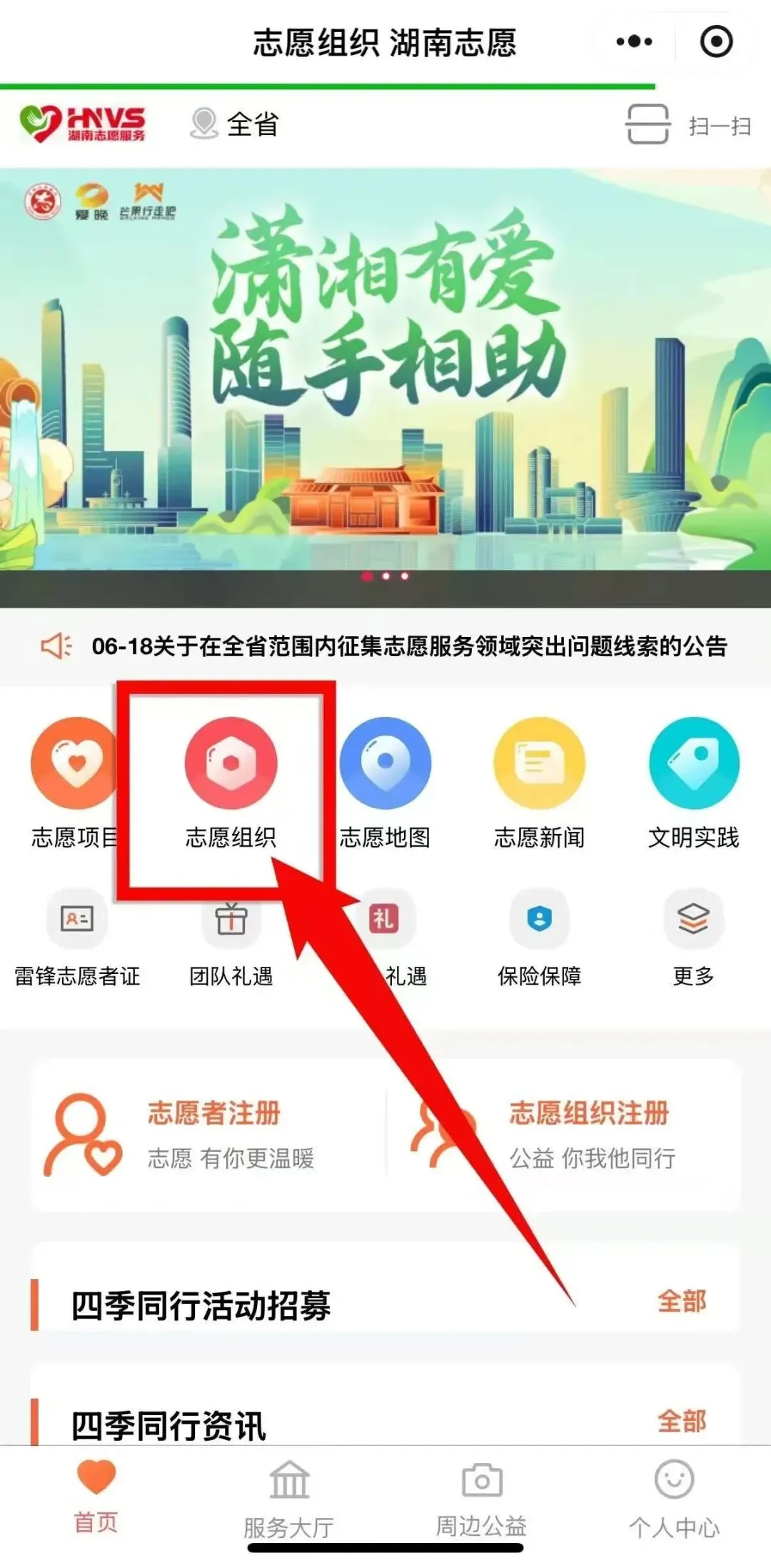 5. 回到首页,点击“志愿组织”,搜索常德消防“武陵蓝焰”志愿服务队,也可以扫描图中二维码。