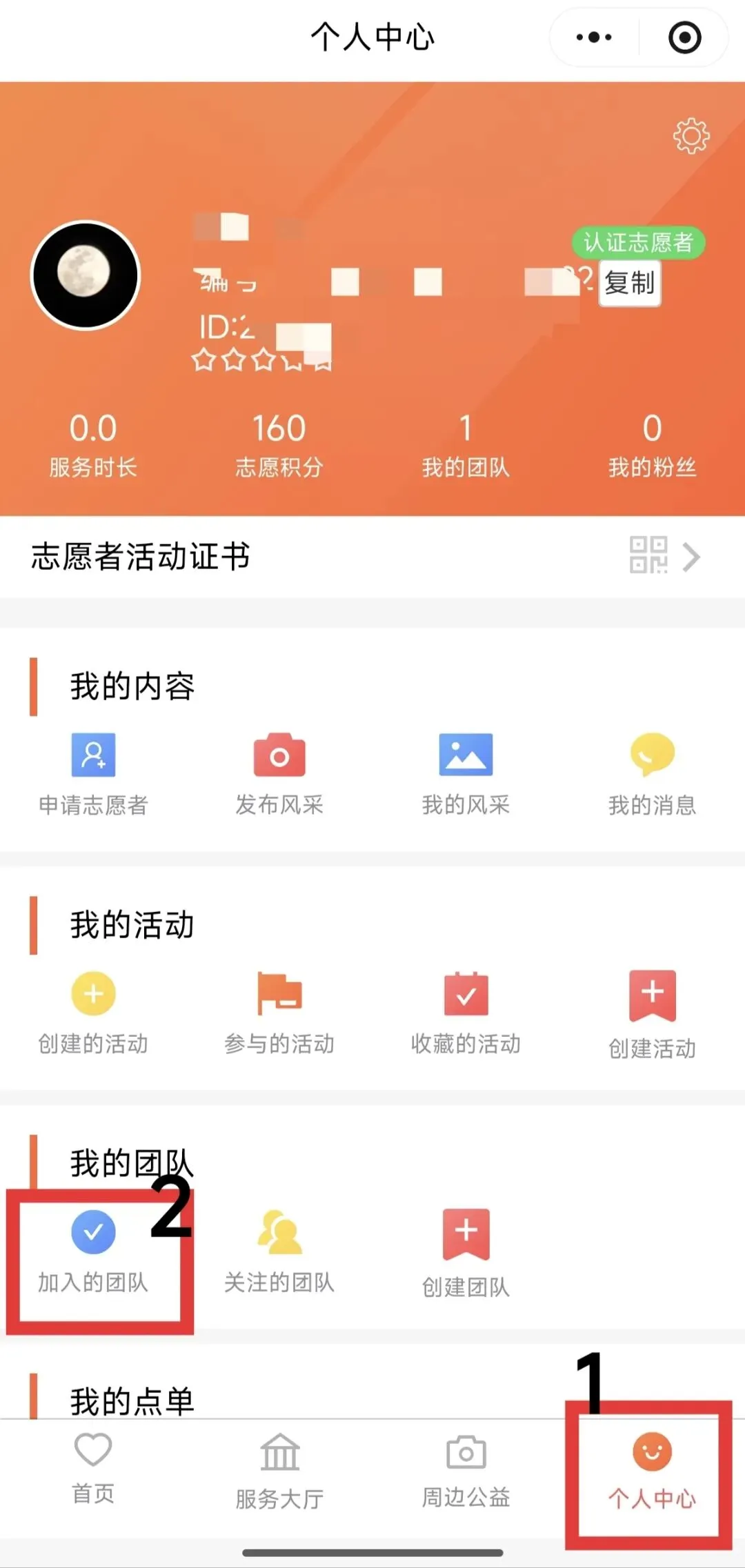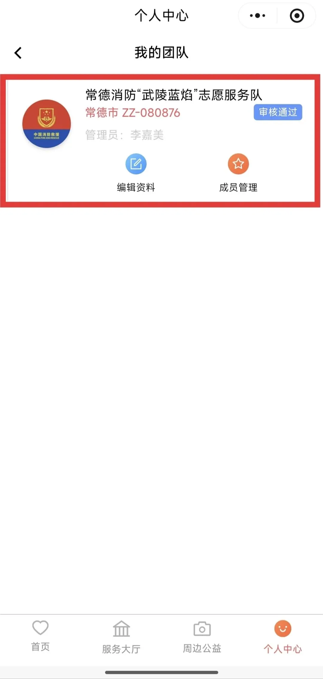 点击“个人中心”栏目,找到“加入的团队”,选择常德消防“武陵蓝焰”志愿服务队。