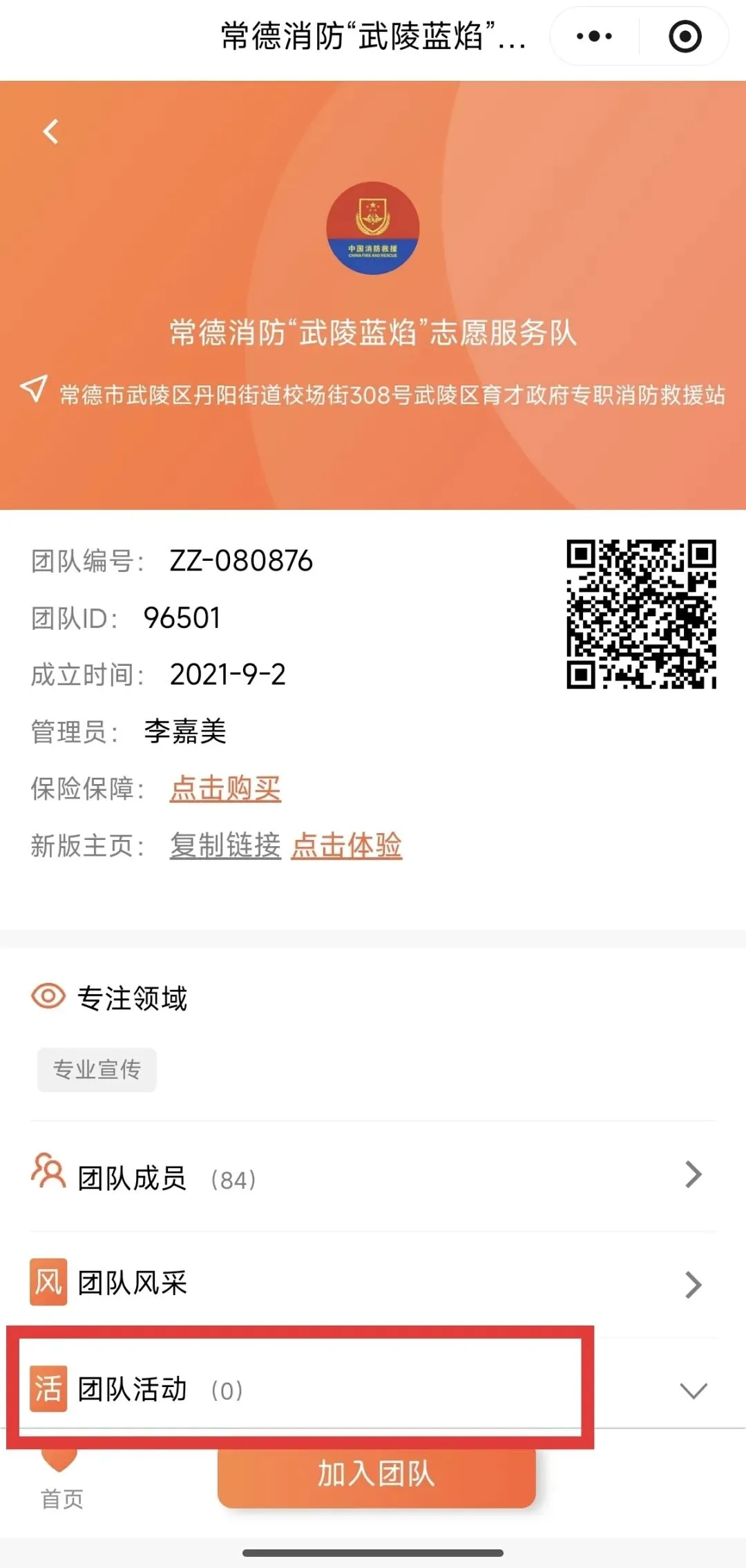 6. 点击常德消防“武陵蓝焰”志愿服务队,进入中心页面后点击右下角“加入团队”等待审核人员同意即可。
