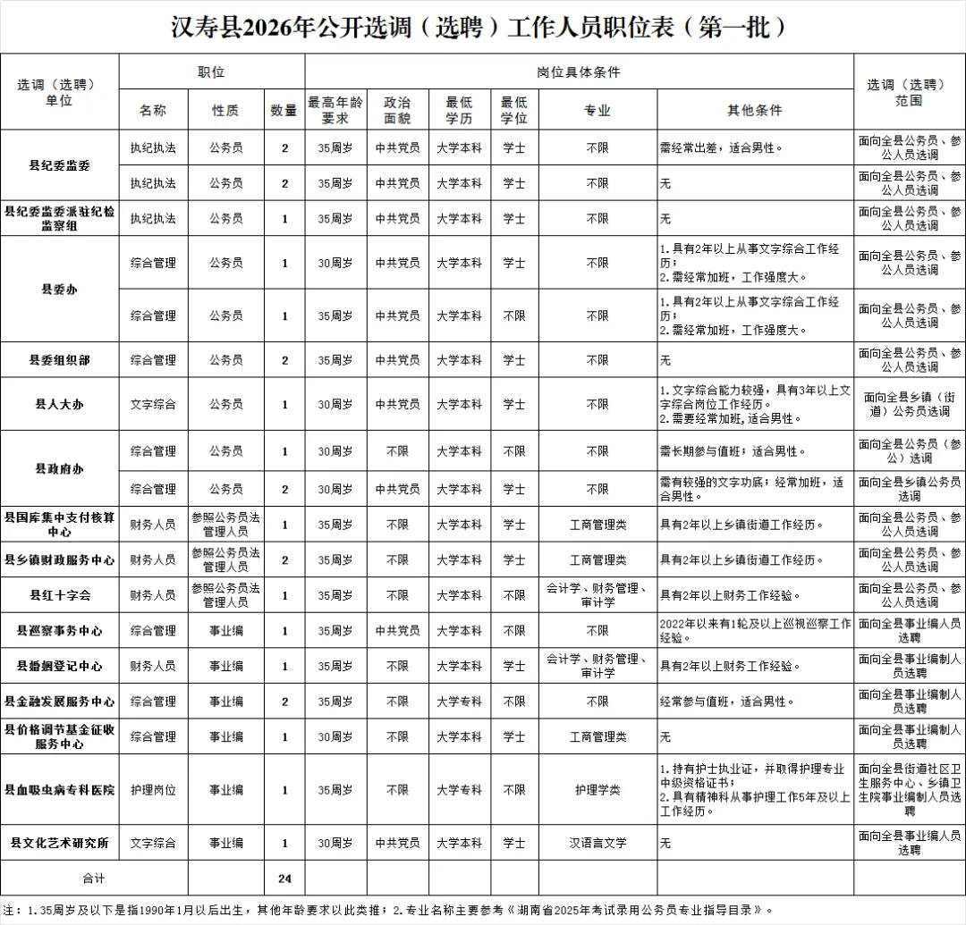 面向全县机关或参照公务员法管理的单位中已进行公务员或参公登记且在编在岗人员公开选调17人。面向全县事业单位中在编在岗的管理岗位工作人员或专业技术人员公开选聘7人。具体职位和资格条件详见《汉寿县2026年公开选调(选聘)工作人员职位表》(附件1)。