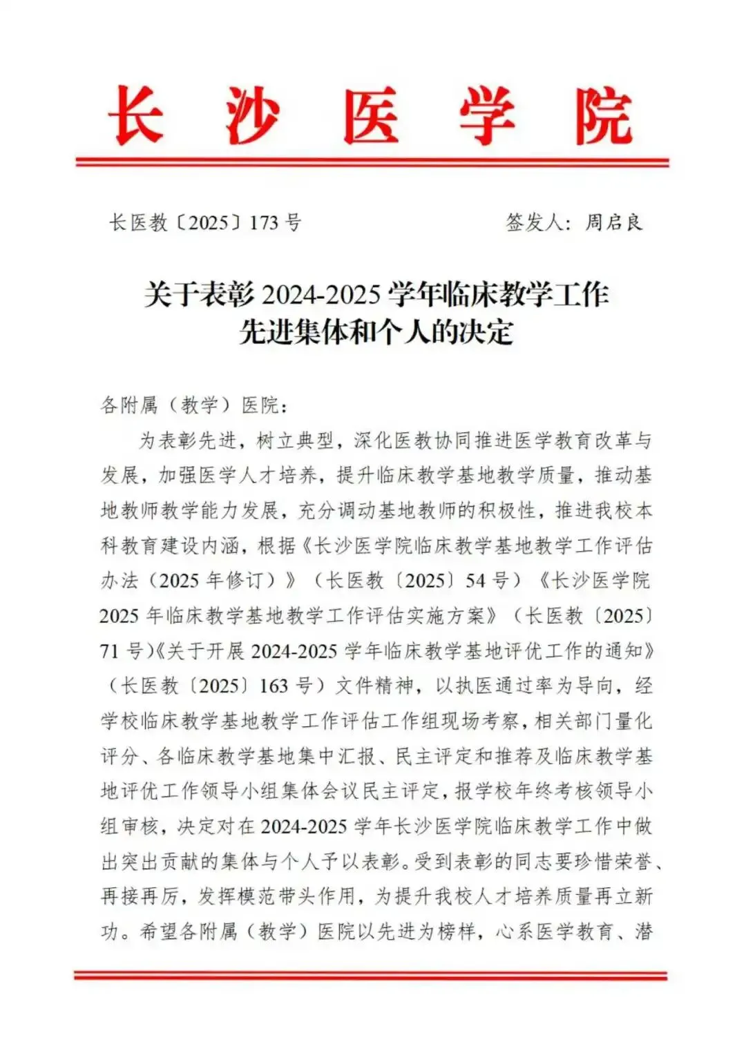 三连冠!近日,我院以基地评估分值排名第一优势再次荣获长沙医学院2025年度"优秀临床教学基地"称号,这是我院连续三年获评长沙医学院"优秀临床教学基地",也是常德地区唯一连续三年获得此荣誉的教学基地。这一荣誉标志着医院在临床教学体系建设、师资培养、教学质量管理等方面取得的卓越成效,彰显了我院作为区域性医学教育基地的综合实力。