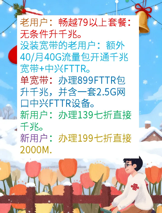 长沙联通宽带套餐,在两年前已经批量给低于300M宽带的用户批量升级的300M宽带速率。而主动升千兆却一直不见动静。可能也是考虑到实际上很多用户的设备并不支持千兆宽带,甚至很多用户的路由器百兆都不支持,如果做动作全部升级千兆,一个是不利于营销,不利于客户升级套餐加装符合千兆速率的路由器,另一个就是客户设备不支持的话,进行升级是容易扯皮的。不过我们这里升级可以告知你啥设备不合格,对着一起升级就是。 正好刷到了我们,而且你又正好是长沙联通老用户,且是老畅越78以上套餐,就关注我们,点击菜单栏的联系我们,我们给你无条件升千兆吧。毕竟这个是去年年底新创的公众号,以前的公众号被阴了,树大招风。这回用营业执照并申请二维码授权新建的,希望更快得获得粉丝量,或者当是交个朋友,增加好友数量,增加客户群,或者等你以后做大做强,搞个企业宽带,或者升级个套餐,无限可能,想想都激动。 单宽带用户:办理899FTTR升级包含全屋WIFI,升千兆,提速长期有效。续费按单宽带原资费,保持1000M,1000M提速包是活动长期有效的,FTTR设备用到坏为止。 新用户:139七折(90G+1050语音+2副卡每个额外10G)直接1000M宽带,工料费199含光猫+WIFI6路由器。或者199七折(220G+1500语音+4个免费副卡额外10G)2000M宽带+IPTV影视至尊会员。工料费299含中兴FTTR全屋WIFI1主1从+机顶盒。THE COLD CURRENT WILL ARRIVE